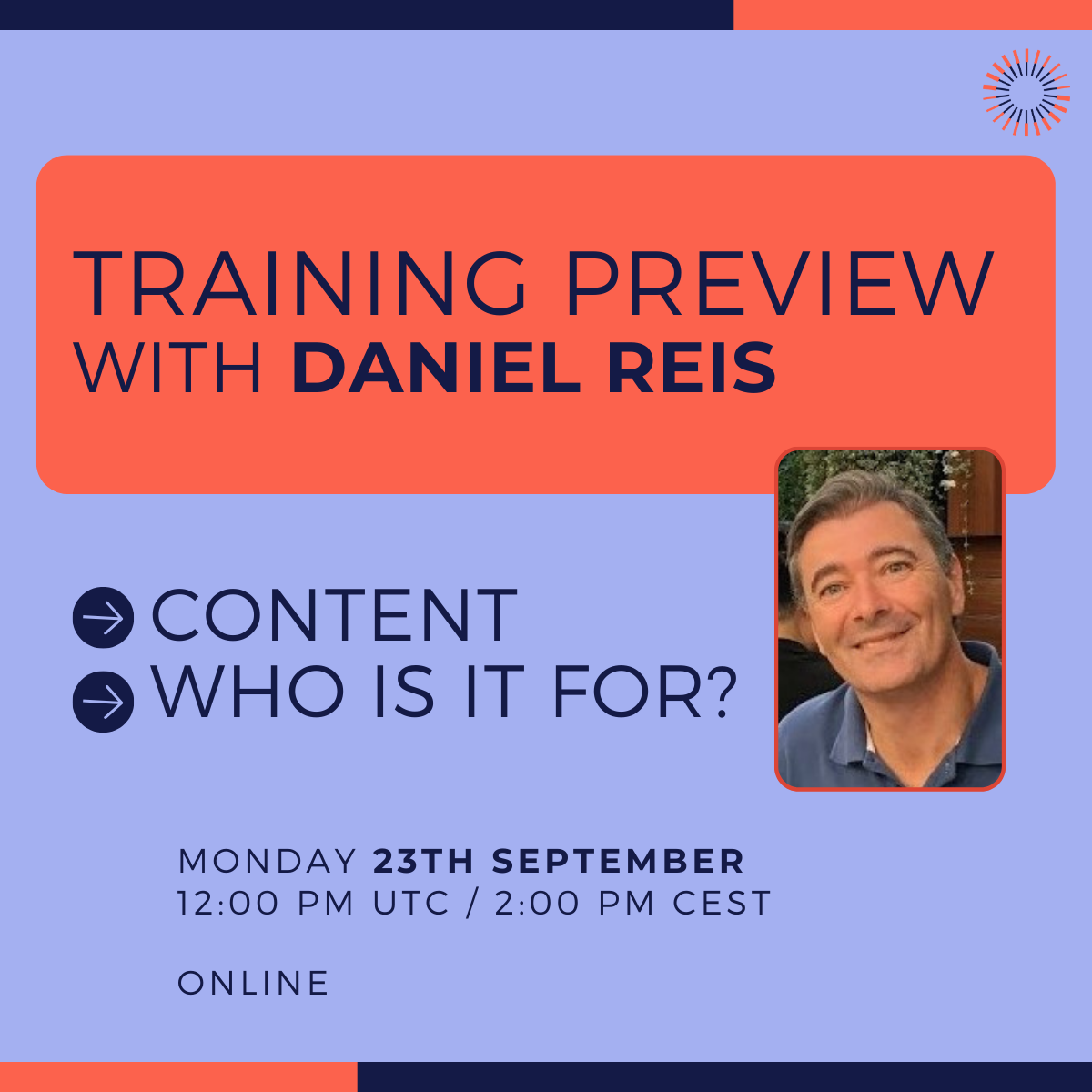 To get a preview on the Training content and to make sure it will suit your needs, we have organised a session with Daniel Reis who will share the benefits participants can expect from joining this training.