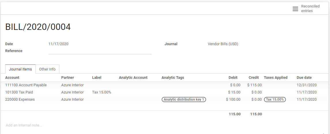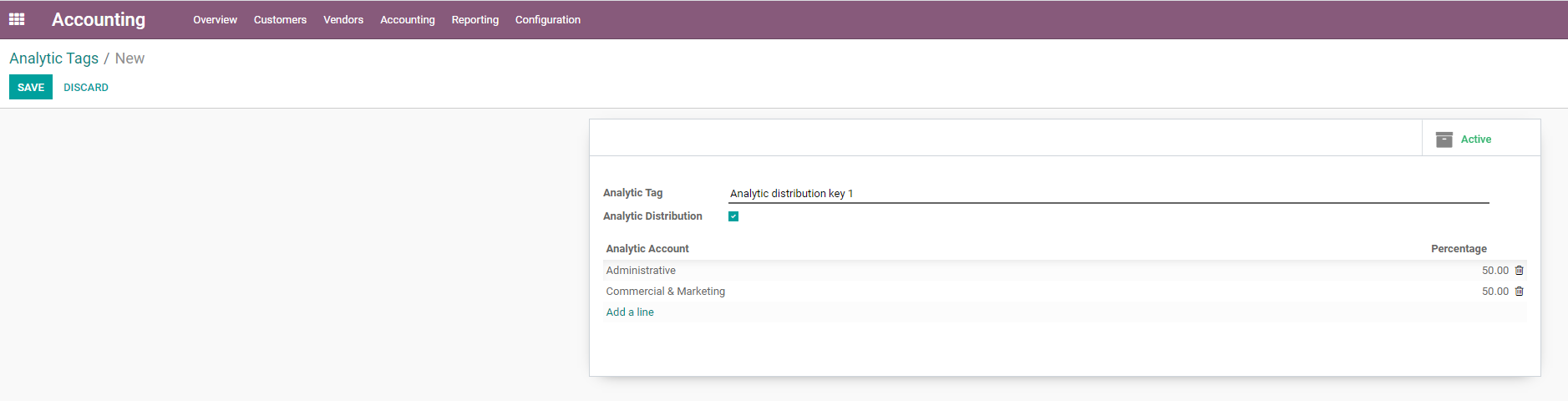 Hi Guillaume,We have the same needs and think similar to you.Before the existence of analytic tags (and analytic tags distributions) we have this module "account_analytic_distribution" that works this way:* on an invoice you choose the "distribution analytic account" on each line (it is a normal analytic account with distribution lines as the new analytic tags of odoo)* when validating the invoice, the account.move was created but account.move.line where splitted if you're using analytic distributionThat way, the distribution works for analytic and accounting reports.We haven't migrated or found an approach for v13+ yet. On v13, with the removal of account.invoice, I was thinking in something similar but perhaps more "manual" on the invoice, a button to split lines, but you won't have a way to go back to the distribution.On Tue, Nov 17, 2020 at 9:57 AM Vandamme, Guillaume <guillaume.vandamme@acsone.eu> wrote:Hello everyone,I'm currently facing an issue with the analytic distribution functionality of Odoo. I would like to share it with you as some may have faced the same issue recently and may be able to help. I'm working on Odoo V12, but the same situation occurs on different versions as well.When checking the 'Analytic Distribution' box on an analytic tag, this analytic tag can be used to allocate a certain percentage of an expense or an income on several analytic accounts.Example: On the picture below, the 'Analytic distribution key 1' analytic tag will allocate 50% of the expense/income on the 'Administrative' analytic account and the remaining 50% on the 'Commercial & Marketing' analytic account.When validating a simple vendor bill of 100 euros with this 'Analytic distribution key 1' selected, Odoo is generating a journal entry with three journal items: payable account, tax account and an expense account (100 euros) which is linked to the 'Analytic distribution key 1' analytic tag. My two analytic accounts (Administrative + Commercial & Marketing) don't appear here.Besides that, Odoo is also generating two analytic items in the 'Accounting --> Analytic items' menu to divide the total amount of the expense (100 euros) according to the distribution key (50% for both analytic accounts). These analytic lines can also be found in the 'Analytic Lines tab' on the expense journal item.My problem is that this breakdown on both analytic accounts doesn't appear in the journal items/entries, it only appears in the analytic items. This makes reporting based on journal items much more complicated (ex: Mis Report to generate a P&L by analytic account).I would rather prefer that the breakdown on both analytic accounts applies directly on the journal entry. Hence, instead of having one expense journal item (100 euros) related to the analytic tag, we would have two expense journal items (50 euros each),both related to their analytic account (Administrative or Commercial&Marketing). This would probably make things much easier.Any thoughts on this?Does this 'problem' sound familiar for some of you? Has anyone ever found a solution for this?Thank you very much for your help,Regards,Guillaume Vandamme--Guillaume Vandamme