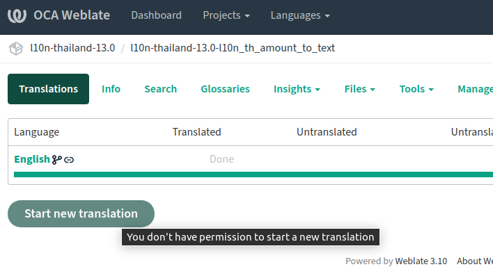 Hi Kitti,You are not currently in any translators group. Please send an e-mail to transbot@odoo-community.org requesting the languages you want to translate to.Best regards,-sbi--On Wed, Sep 30, 2020 at 3:07 PM Kitti Upariphutthiphong <kittiu@ecosoft.co.th> wrote:Looks like I don't have the permission. How can I have it?On Wed, Sep 30, 2020 at 7:01 PM Enric Tobella <etobella@creublanca.es> wrote:You need to add the language on each component.Select the module and then, you will see the button "Start new translation"Kind regards,Enric Tobella AlomarCentros Médicos Creu BlancaTel: 902 202 230Tanto este mensaje como los documentos que, en su caso, lleve como anexos,