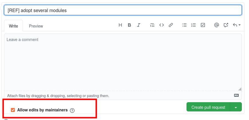 Sylvain, it's not something that can be decided when the branch from which you make the pull request belongs to an organization instead of an individual user. GitHub doesn't allow you to push to that branches even if the pull request has that check marked. I don't understand such limitation, but it's there, and most of the regular contributors (Acsone, ForgeFlow, Tecnativa, etc) use this technique for allowing anyone in the team to handle the PR.I understand then that this command can't be used in such PRs.Regards.