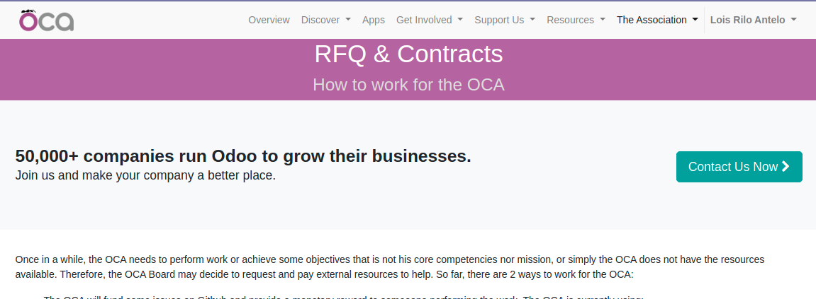 Hi Pedro,Great work here!Just two details I found in the web:* https://odoo-community.org/integrators return an error (even logged in).* at https://odoo-community.org/page/rfq-process, the "Contact Us Now" button (I don't know if that snipped makes sense there btw) is redirecting to an unexisting page.Thanks again for the efforts!Regards,El mié., 21 ago. 2019 a las 10:32, Lorenzo Battistini (<elbaddy@gmail.com>) escribió:Thanks!On Tue, 20 Aug 2019 at 18:47, Pedro M. Baeza (Tecnativa) <pedro.baeza@tecnativa.com> wrote:Hi, Lorenzo,> At page https://odoo-community.org/page/List links to specific projects give 404, like https://odoo-community.org/project/9Page https://odoo-community.org/page/List is an old one that was replaced by https://odoo-community.org/psc-teams. I have unpublished it for avoiding more errors, and setting a redirection to the new one.- > Menu "Discover > Modules & Apps" points to "Projects & Apps" page (I think the menu's label should be changed)