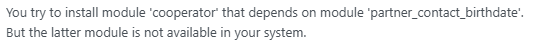 Hi Lope,The image is missing in your email.Regards,HoussineLe ven. 4 avr. 2025 à 16:37, Lope Soriao <notifications@odoo-community.org> a écrit :thanks victor, after many hours, i was able to update my app list, but when time to activate cooperative another module is missing can you help me pls. that isattached is the error message. thanks