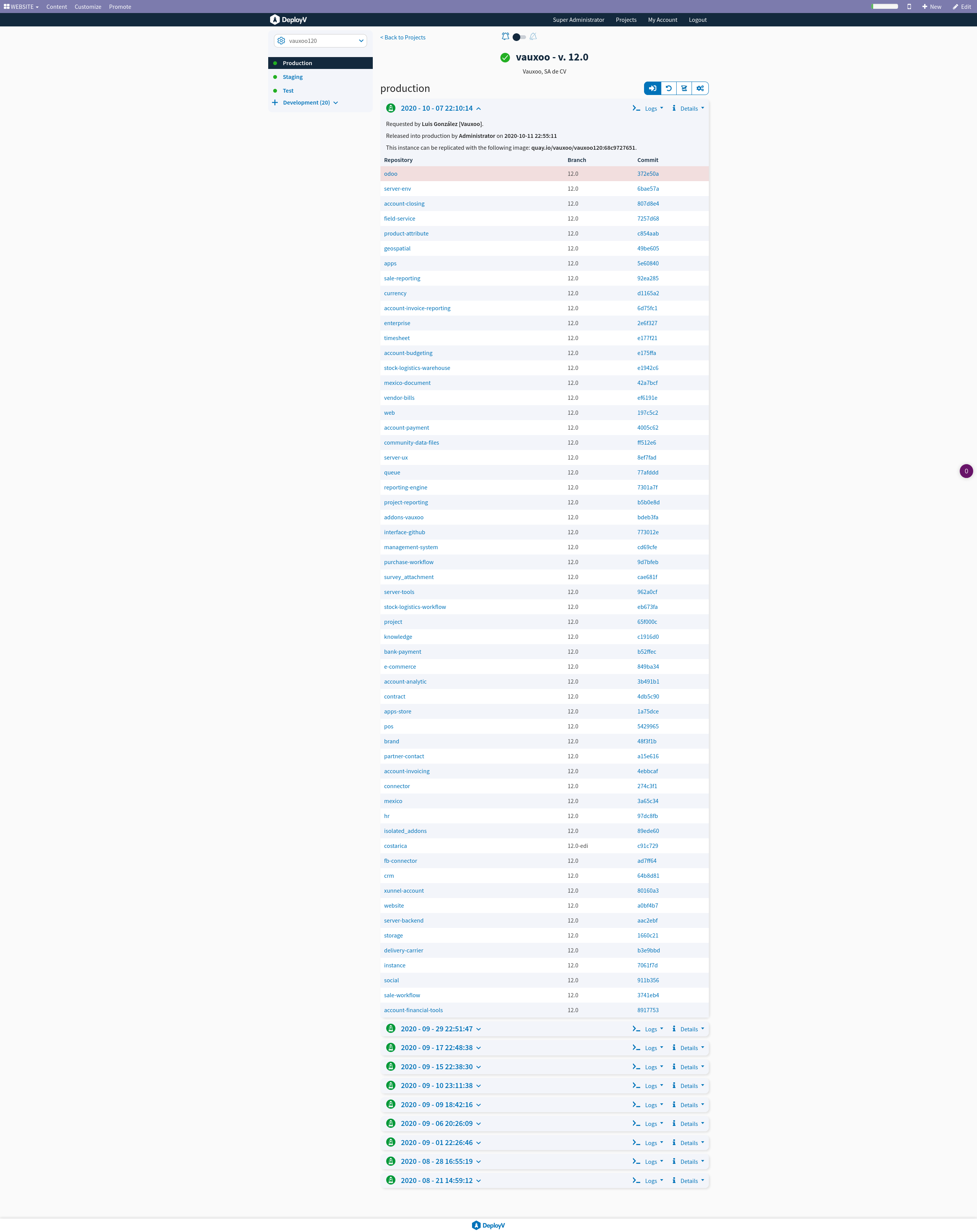 Let me show graphically.How do you audit a server?dev-test-ci-production environments are as much alike as possible [1].Then when debugging and development the flow to consume is:Consume.$ git pull repository.Share and propose.$ git checkout -b branch$ git push$ git PR.With 5 commands 100% of the:Test.Update.Staging.ProductionAre 100% the same (even the CHECKSUM OF FILES ARE THE SAME).That mindset rely on git (impossible or at least more complicated with PIP).An example of this working:With 1 click I update all/audit and analize (in the image is our own vauxoo.com instance) we have more information without give access to our production server, but I hope it explains itself.I hope it helps.Good practice says: CI-DEV-TEST-PROD should be as equal as possible. (spotify is one of the best examples for this) https://github.com/spotify/luigi.Distribution of the package I am 100% agree with PIP (that's not my point) my point is rely on PIP for the CI and come back to oca_dependencies.txt when this must be in the other way around, oca_dependencies.txt gererates the PIP package.And force has only 1 way to do it.Regards.El lun., 12 de oct. de 2020 a la(s) 15:32, Graeme Gellatly (gdgellatly@gmail.com) escribió:Hi,Honestly I tried both ways. Trying to have nice neat build OCA installing modules. I even setup own Pypi server to distribute client modules. This is basically how the pip workflow worked.pip install some_moduleOh it has a bug and I need to make a PR.pip uninstall some_oca_modulegit clone OCA/Webgit-aggregator file while PR waiting.pip install some_other_modulerinse repeat.Felt like every single module. Now maybe in a pure deployment environment pip works, maybe once a release is mature it does too and maybe I am a dinosaur and my workflow using git is stupid, but I just don't like using the python packaging for Odoo. Just too much stuff from too many different places. And unless every module you want to use is pip available then it just feels like 2 different processes even when there are no issues.On Tue, Oct 13, 2020 at 9:12 AM Nhomar Hernández <nhomar@vauxoo.com> wrote:Hello Daniel.Yes I understand.AFAIK there is a problem with the version in pip.How do you cohexsists 14-13-12-11 in the same environment?How do you manage to do "from odoo import odoo" and falling apart virtualenv, how do you manage such coexistence?I am pretty sure it is out of the scope from odoo (but they are not closed to do it) because the owner of the pip package is vauxoo.Olivier asked us a few years ago to give it to them but then after a few conversations it was never a priority to them (but maybe that will change).Regards.PS: can you share the command to tray it from github?I tried several options and I can't get it to work.El lun., 12 de oct. de 2020 a la(s) 12:47, Daniel Reis (dreis@opensourceintegrators.com) escribió:On 12/10/2020 11:07, Nhomar Hernández wrote: