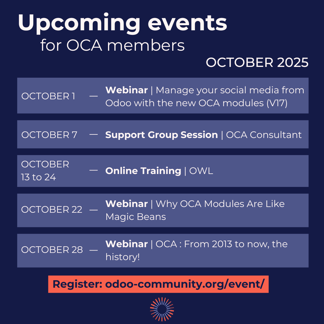 - October 1: Webinar - Manage your social media from Odoo with the new OCA modules V17